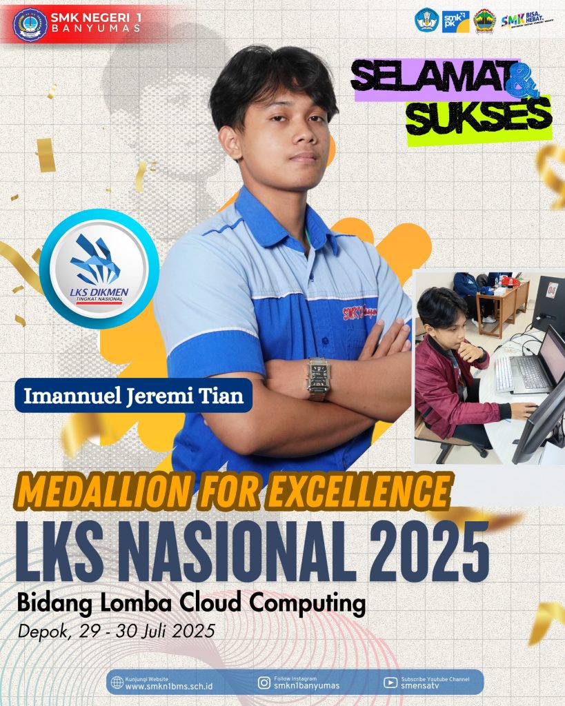 Salah satu kebanggaan besar yang berhasil ditorehkan oleh siswa SMK Negeri 1 Banyumas pada tahun 2025 adalah pencapaian gemilang dalam ajang Lomba Kompetensi Siswa (LKS) Bidang Lomba Cloud Computing Tingkat Nasional 2025, yang diselenggarakan di DKI Jakarta dan Jawa Barat oleh Balai Pengembangan Talenta Indonesia (BPTI) Pusat Prestasi Nasional (Puspresnas) pada tanggal 29 – 31 Juli 2025. Dalam ajang bergengsi tingkat nasional ini, siswa kami dari jurusan Teknik Jaringan Komputer dan Telekomunikasi (TJKT) atas nama Imannuel Jeremi Tian bersaing dengan puluhan peserta terbaik dari seluruh provinsi di Indonesia dan berhasil meraih Medallion of Excellence.